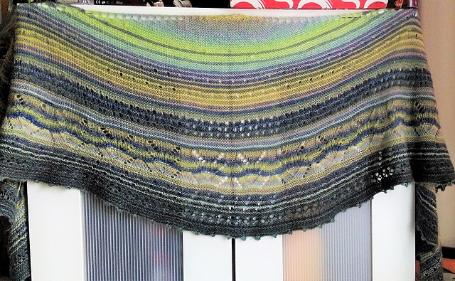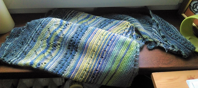 Jak na wełnę przystało, chusta nieźle się rozciągnęła w procesie blokowania - nie mierzyłam jej zaraz po zdjęciu z drutów, ale po wyschnięciu ma 230 (!) cm szerokości i 55 cm wysokości. Strasznie jest szeroka, krótko mówiąc. Zawsze mnie zastanawia, jak takie coś owinąć wokół szyi, żeby jakoś wyglądało.