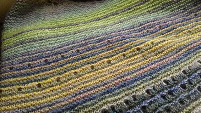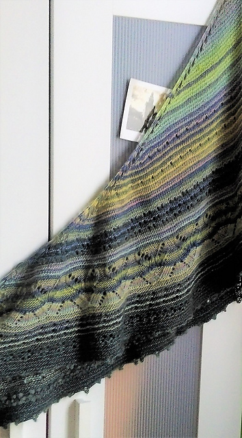 Zresztą - nie wzór był tu najważniejszy. Zgodnie ze słowami autorki, chusta została zainspirowana nurtem impresjonistycznym - i jak na impresjonizm przystało, ogromną rolę w kompozycji odgrywały kolory - w robótce łączone za pomocą modnej ostatnio techniki "fading". Technika ta polega ni mniej, ni więcej na tym, że wybieramy włóczki różniące się odcieniem na tyle, żeby było to zauważalne, ale jednocześnie na tyle podobne, żeby przejście wyglądało naturalnie - po czym zmieniamy je co kilka rzędów, na początku częściej, potem już rzadziej, żeby pasma się wydłużyły. Bardzo fajna sprawa - jeszcze fajniejsza, kiedy ktoś ma wyczucie kolorystyczne, którego mi niestety trochę brakuje.